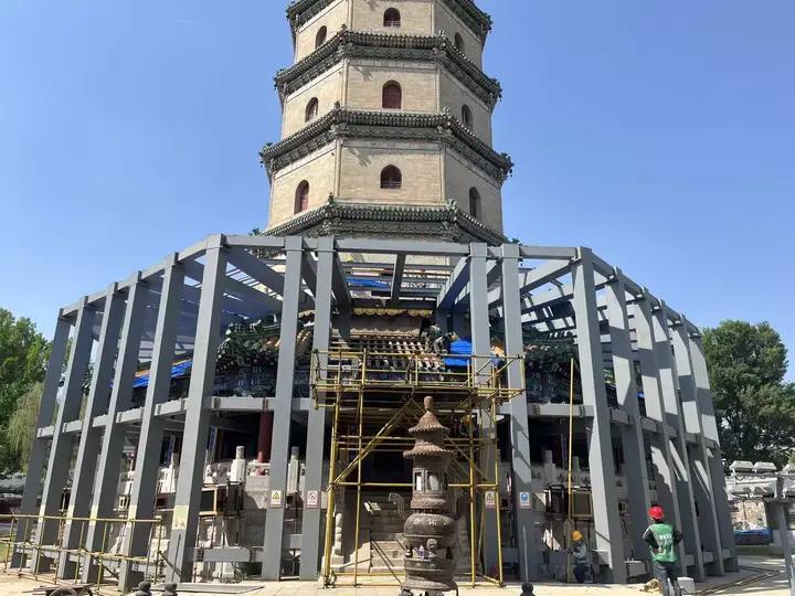 “好比給珍貴瓷器穿護(hù)甲,卻不允許碰到瓷面?!表?xiàng)目負(fù)責(zé)人白延這樣比喻。傳統(tǒng)腳手架在這里行不通——且不說(shuō)塔身造型復(fù)雜,單是《文物保護(hù)工程管理辦法》中“古建筑嚴(yán)禁設(shè)置永久性拉接點(diǎn)”的規(guī)定,就讓常規(guī)手段全部失效。