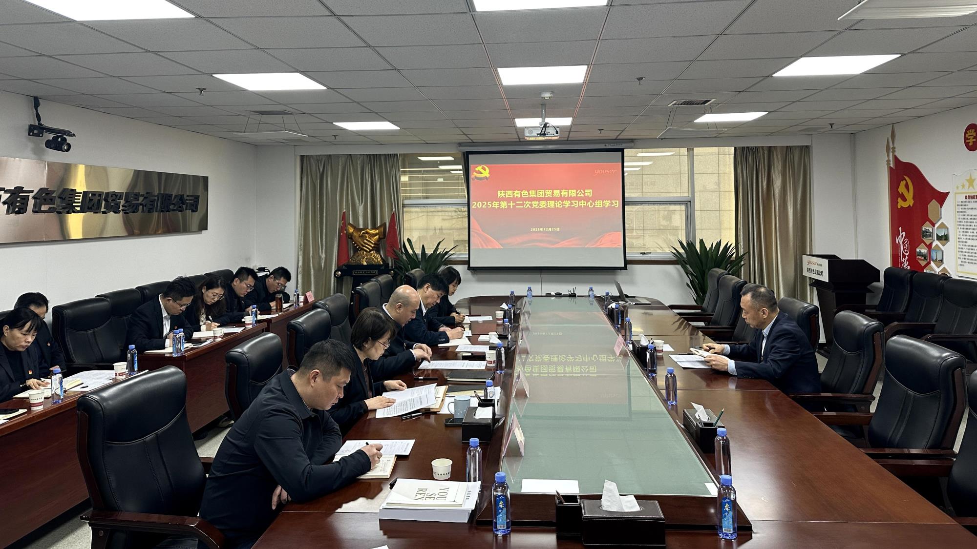 12月25日,貿(mào)易公司召開2025年黨委理論學(xué)習(xí)中心組第12次學(xué)習(xí)會議。陜西有色金屬集團黨委委員、副總經(jīng)理趙黎明到會旁聽督導(dǎo),貿(mào)易公司黨委書記石正軍主持會議。