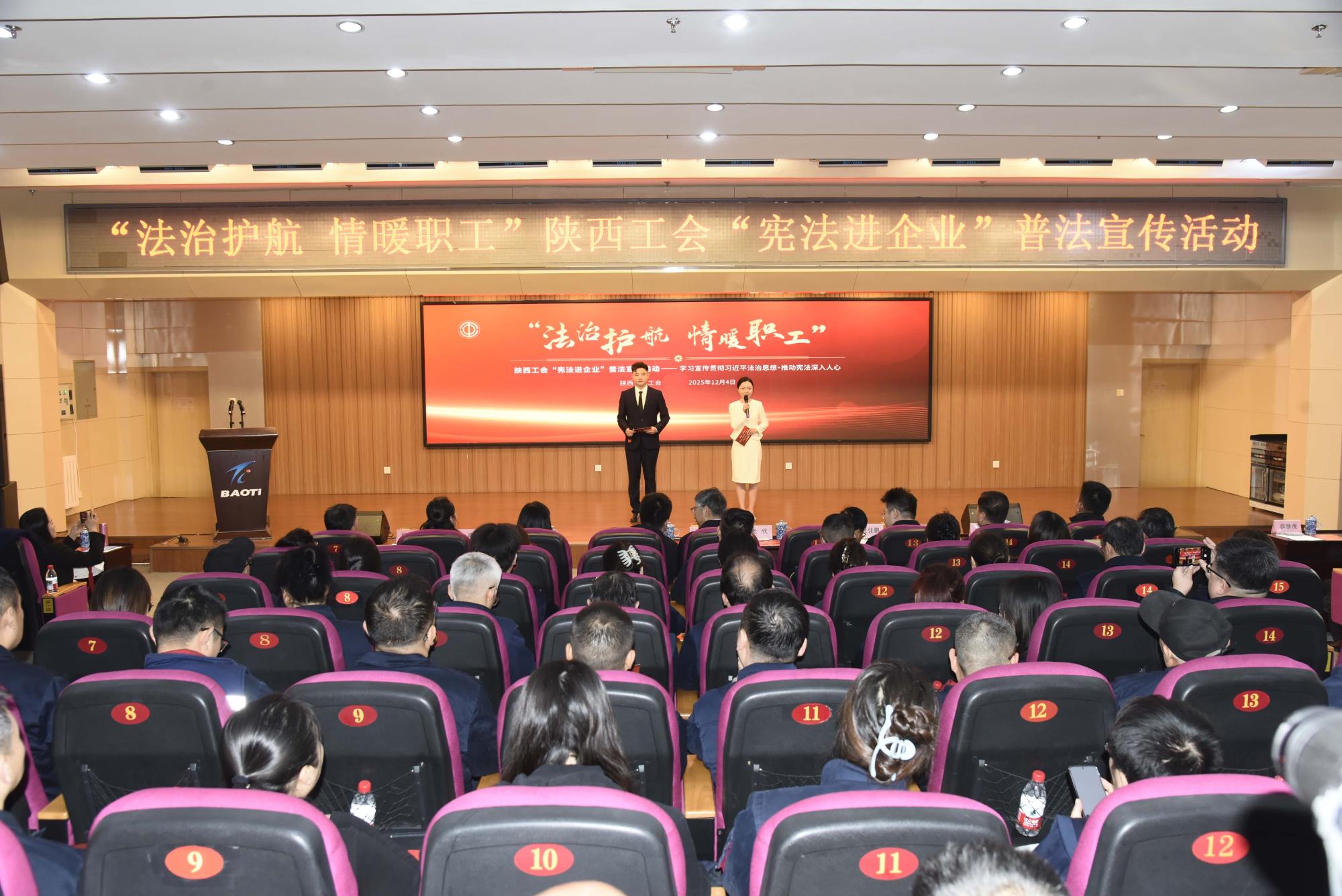 12月4日,第十二個(gè)國家憲法日當(dāng)天,由陜西省總工會主辦,省機(jī)械冶金建材工會、寶雞市總工會協(xié)辦的“法治護(hù)航·情暖職工”陜西工會“憲法進(jìn)企業(yè)”普法宣傳活動在寶鈦集團(tuán)寶鈦賓館七樓學(xué)術(shù)報(bào)告廳舉行。